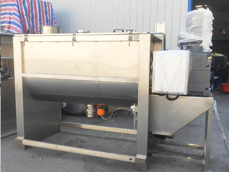 臥式螺帶混合機由U形筒體、螺帶攪拌葉片和傳動部件組成,螺帶狀葉片一般做成雙層工作時外支層摞帶將物料從兩側(cè)向中央?yún)R集,內(nèi)層螺帶將物料從中央向兩側(cè)輸送,形成對流混合。攪拌部件還可以制作成槳葉式或增加飛刀,適應不同的物料。筒蓋可做成拱形或全開式,拱形可以承壓,全開式方便清洗設備內(nèi)部。臥式螺帶混合機適用于粉料與粉料、顆粒與粉料、粉料與少量液體的混合,該機對混合物適用性廣,對粘性物料能混合均勻,對顆粒物料能盡量保持顆粒的完整,對配比差異達到1:1000-1:10000的物料能較好的混合。還可以根據(jù)用戶的要求制作加熱、冷卻、正壓、真空。