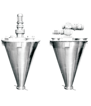 雙螺旋錐形混合機筒內(nèi)兩只非對稱螺旋自轉(zhuǎn)將物料向上提升,轉(zhuǎn)臂慢速公轉(zhuǎn)運動:使螺旋外的物料,不同程度進入螺柱,從而達到全圓周方位物料的不斷更新擴散,被提到上部的兩股物料再向中心凹穴匯合,形成一股向下的物料流,補充了底部的空缺,從而形成對流循環(huán)的三重混合效果。物料在較短時間內(nèi)獲得了均勻混合,混合程度較高。雙螺旋錐形混合機是一種新型、高效、高精度的混合設(shè)備,廣泛適用于制藥、化工、飼料等行業(yè)的各種粉粒體物料的混合。