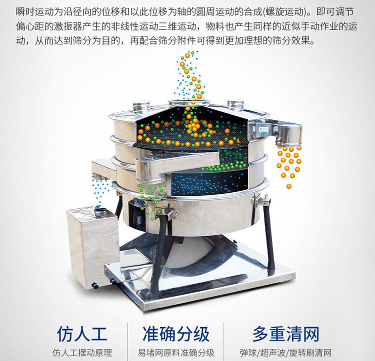 1、回旋式篩分:兩層同樣孔徑的篩網(wǎng),讓篩過一次的物料再次篩分,以達(dá)到更高的篩分精度。