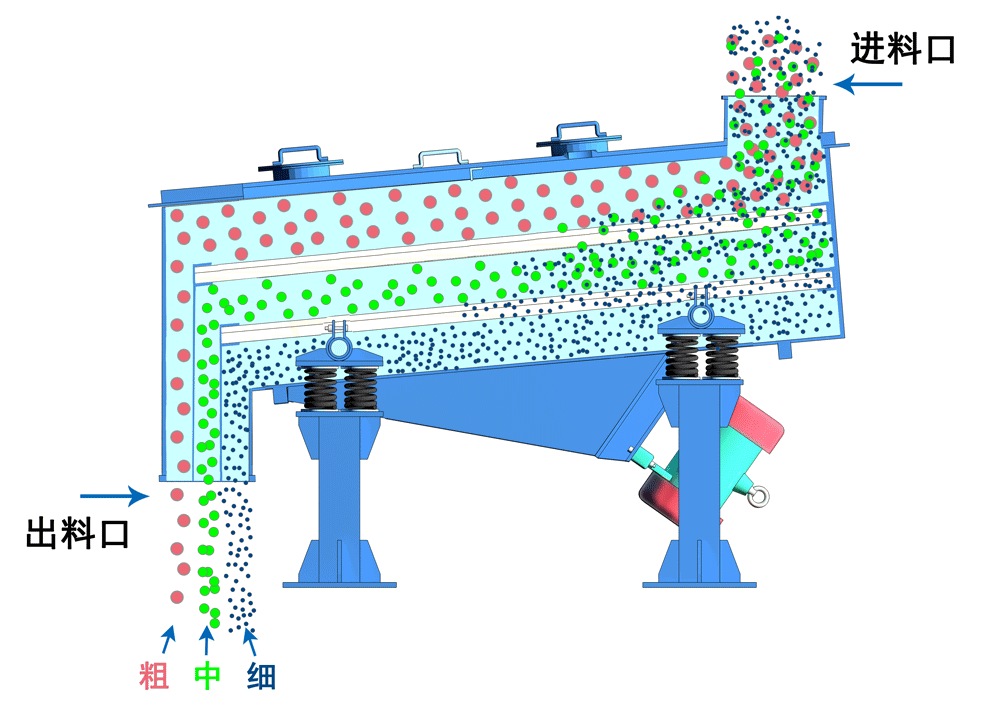 直線篩是雙振動電機(jī)驅(qū)動,當(dāng)兩臺振動電機(jī)做同步、反向運(yùn)轉(zhuǎn)時(shí),其偏心塊所產(chǎn)生的激振力在平行于電機(jī)軸的方向相互氏消,在垂直于電機(jī)軸的方向疊為一合力,因此物料在直線篩機(jī)上的運(yùn)動軌跡為直線向前做拋物線運(yùn)動,兩電機(jī)軸相對篩面有一傾角在激振力和物料自重力的合力作用下物料在篩面上被拋起跳躍式向前作直線運(yùn)動,從而達(dá)到對物料進(jìn)行篩選和分級的目的。