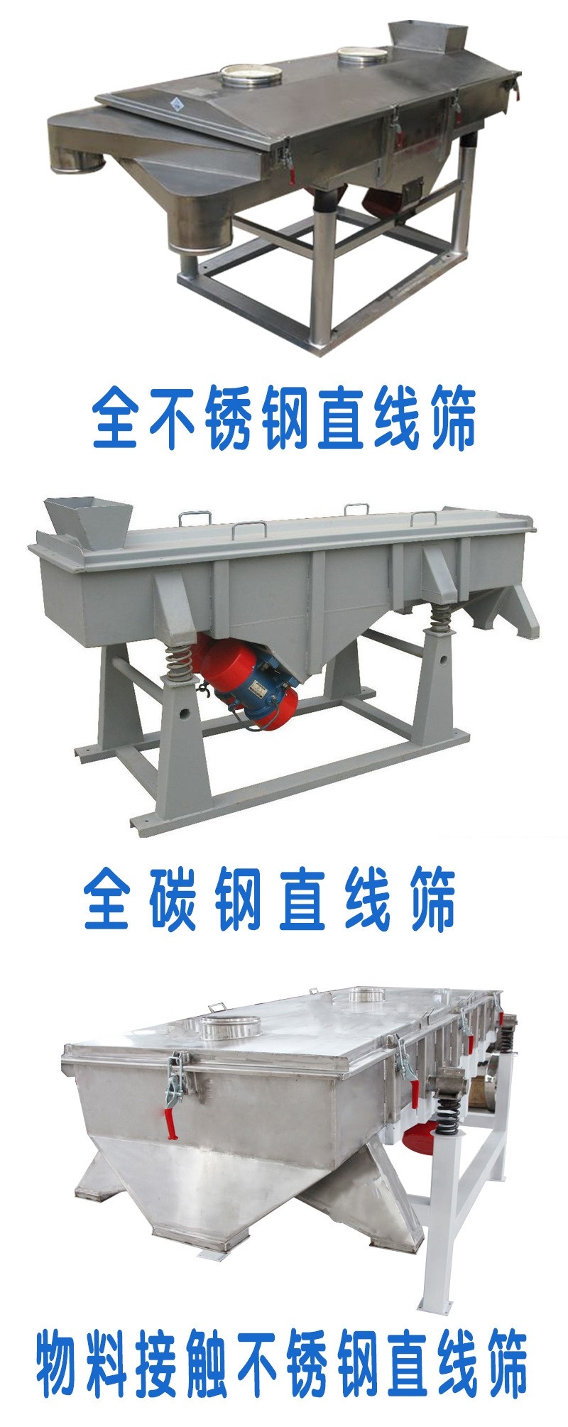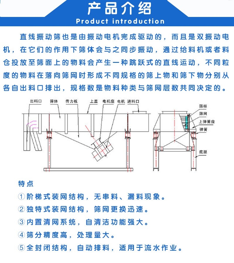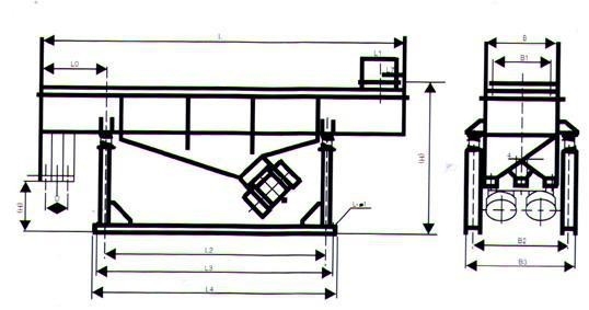 直線振動篩由篩箱、振動電機(jī)、減振系統(tǒng)及底架等組成。篩箱由槽體、上蓋、進(jìn)料口、篩框、篩板(網(wǎng))、襯網(wǎng)、出料口等組成。減振系統(tǒng)由阻尼彈簧和彈簧座等組成。