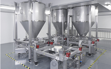 在投料環(huán)節(jié),物料使用無塵投料站或噸袋拆包機等投料設(shè)備投料,物料密閉下料至料倉,過程中采用單機除塵或集中除塵,防止物料飛揚。系統(tǒng)根據(jù)控制指令要求,按照工藝配方參數(shù)自動完成主輔料的稱重配料,當數(shù)值達到預(yù)設(shè)目標值時,則關(guān)閉加料閥門并輸送至給料機中。物料在輸送過程中,對于流動性不好的物料,可增設(shè)振動給料機或活化助流裝置等,提升物料輸送效率。