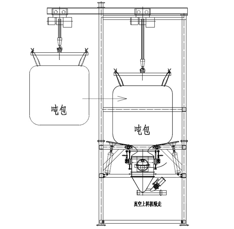 3、倒袋后物料配套真空輸送或管鏈輸送機(jī)到制定儲(chǔ)料裝置(用料點(diǎn))